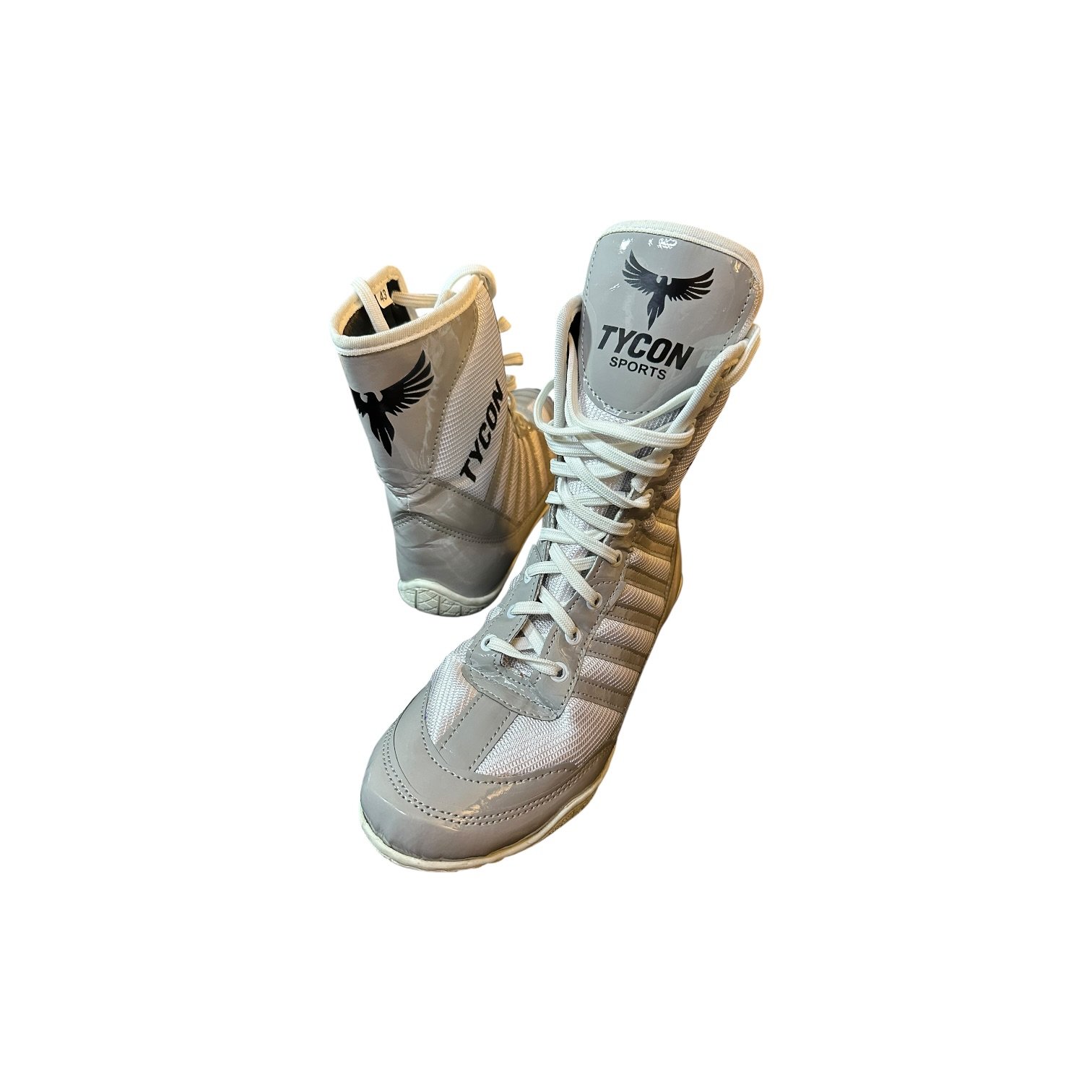 Your Hands Deserve Wings And Your Feet Deserve Speed. Introducing the Professional Boxing Shoes by Tycon Sports. Engineered for elite performance, these boots are crafted from a master blend of high-grade gray synthetic leather and white breathable mesh, offering a lightweight feel and a clean, modern look for the high-speed fighter.